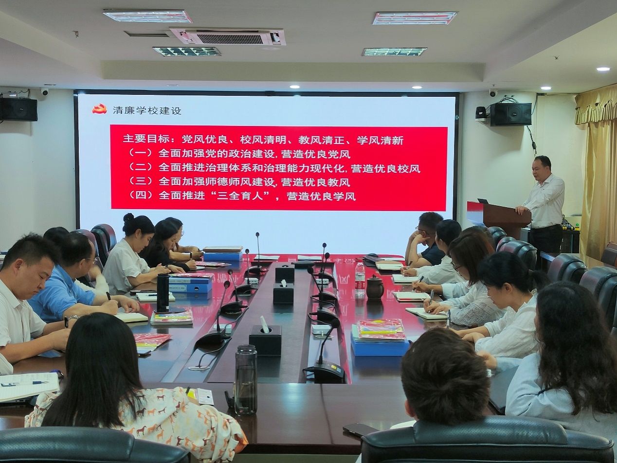 他指出,以高质量党建引领保障高质量发展,要构建党委统一领导,党政齐抓共管,纪委组织协调,师生支持参与的党风廉政建设工作机制,要做到“三个坚持”。一是坚持党建引领,压实“管根本管全局”的主体责任。要加强党的领导,强化政治担当,完善制度建设,畅通体制机制,要做好结合文章,实现互融共促。二是坚持“严”的基调,形成“常态化长效化”的监督制约。要强化监督执纪问责,要一体谋划推进党风政风、师德师风、学风校风建设,要推动开展党风主题月活动和集中性纪律教育。三是坚持“高”的标准,形成“高质量见实效”的办学实绩。要提高政治站位,扎实完成年度重点工作,要拉高工作标杆,勇于自我革命,要提高工作水平,加快争先进位。