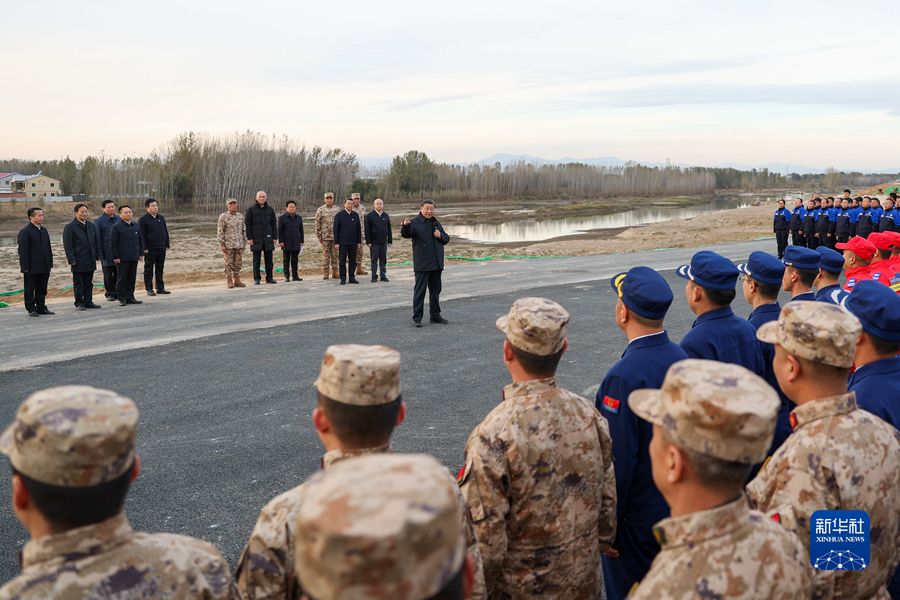 11月10日,中共中央总书记、国家主席、中央军委主席习近平在北京、河北考察灾后恢复重建工作。这是10日下午,习近平在河北保定涿州市白沟河治理工程(涿州段)考察时,同水利工程建设人员和曾经参加涿州抗洪救援的解放军和武警部队官兵、民兵预备役人员、消防救援队伍等方面的代表亲切交流。新华社发(盛佳鹏摄)
