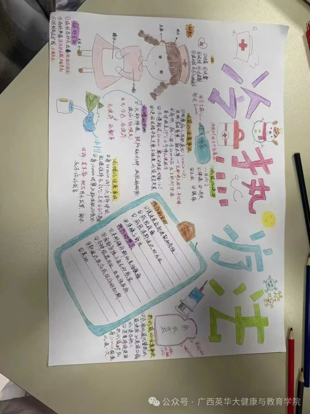 负责《基础护理学》课程的谢筱瑞老师则聚焦“学生专属学习资源与材料补充”需求,利用专项预算采购了水彩笔、画纸等物料。在讲解冷热疗法相关知识后,她设计“健康宣传海报绘制”实践环节,让学生结合课程知识点发挥创意创作。这一新颖形式极大激发了学生的创作热情与学习主动性,大家积极动手、大胆构思,将专业的护理知识融入生动的画面设计中。过程中,学生主动梳理知识点、主动交流设计思路,不仅加深了对冷热疗法适用场景、操作要点的记忆,更锻炼了知识应用与创新表达能力,彻底摆脱“被动听课”的状态,课堂从“教师单向讲授”转变为“师生双向互动、生生协作探究”的高效模式。