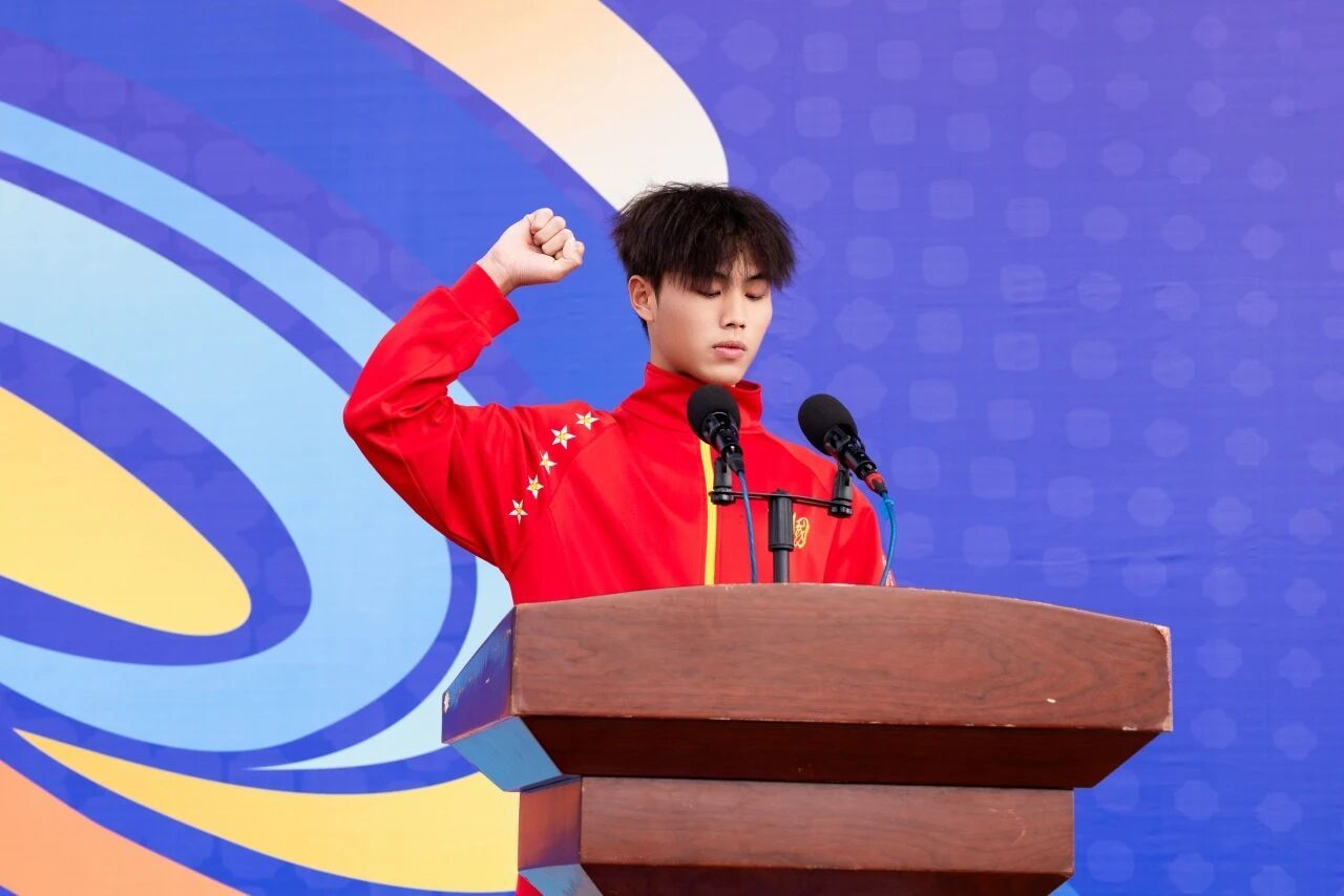 运动员代表与裁判员代表依次登台宣誓。2025 级社会体育专业吴佾洧同学作为运动员代表,承诺将秉持体育精神,奋勇拼搏、尊重对手、遵守规则;通识教育学院林国锋老师作为裁判员代表,表态将以专业严谨的态度公正执裁,守护赛事公平。字字铿锵有力,既传递了对体育精神的敬畏,也彰显了对公平竞赛的坚守,更饱含着对本届盛会的美好期待。
