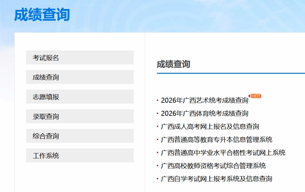 届时,考生可登录“广西招生考试院”网站(网址:https://www.gxeea.cn)“系统导航—成绩查询”栏目,凭职教高考报名序号和身份证号码,以及报名时绑定的手机号码所收到的短信验证码登录,即可查询本人职教高考考试成绩。