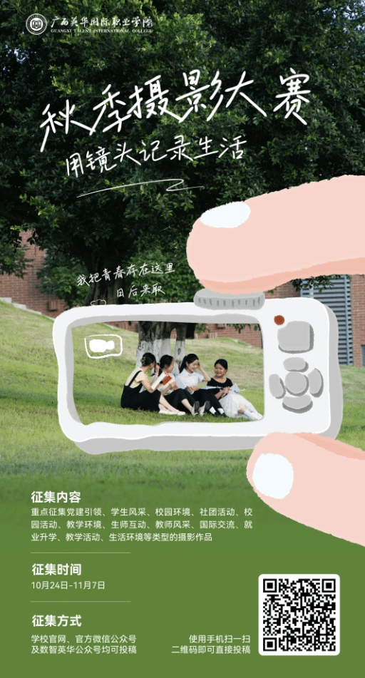现在,「广西英华国际职业学院秋日照片征集活动」正式启动,邀你用快门定格英华秋韵,将您定格的秋日记忆上传至学校【图片视频分享库】,让你的作品成为校园记忆的一部分,更有惊喜礼品、定制文创等你拿!