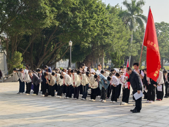 在牛圩坡烈士纪念碑前,师生没有被“灌输”英雄事迹,而是先聆听党支部书记梁淳一讲述小董起义的背景,随后默哀、沉思。那一刻,学生不再是“观众”,而是“当事人”——于心底自问:“如果是我,我会怎么选择?”有人悄悄落泪,有人低头不语,但每个人都在与历史对话,与信仰对视。