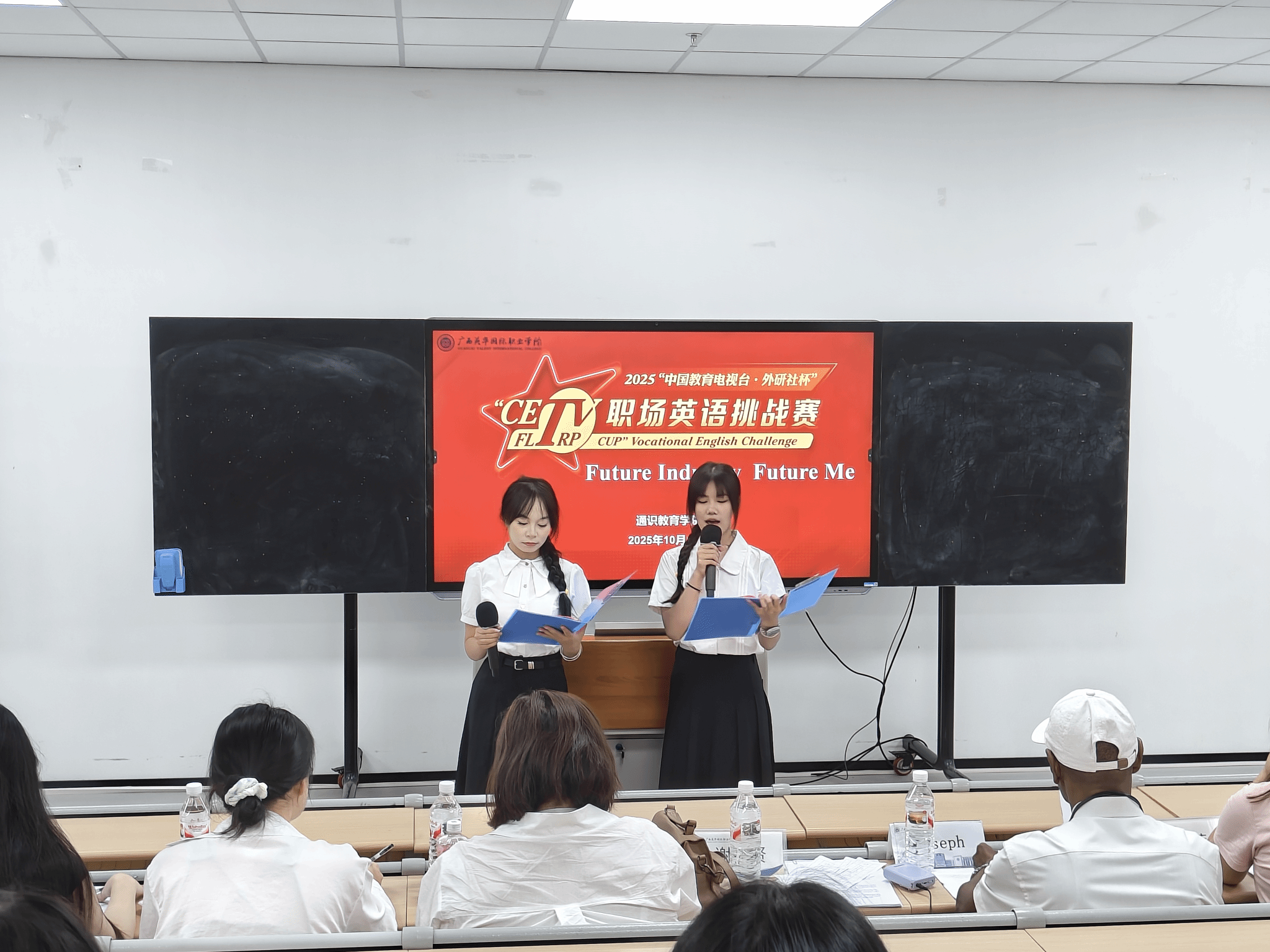 2025年10月15日,通识教育学院主办的2025年“中国教育电视台·外研社杯”职场英语挑战赛校级决赛圆满落幕。本次大赛以“Future Industry · Future Me”为主题,旨在激发全校学生英语学习热情,提升语言综合应用能力,并为2026年广西职业技能大赛英语口语赛项选拔优秀人才。