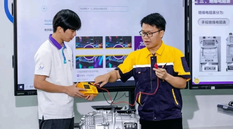 从“车型结构认知”到考取低压电工证,再到进入吉利门店实习,每一步都有企业导师全程指导。师资团队由62%具有企业一线工作经历的校内“双师型”教师与每月驻校的吉利技术导师共同组成,确保学生所学与行业前沿技术动态无缝接轨。2025年,我校新能源汽车专业教师团队刚斩获广西职业院校教师教学技能大赛一等奖。